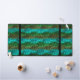 Motif ondulé en vert. Quatre nuances de vert travaillé au crochet. Deux bandes noires verticales de chaque côté.