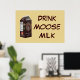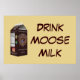 A milk carton from world famous and entirely mythical Matanuska Moose Milk dairy farm in Willow Alaska; not too far from Anchorage. The slogan "Drink Moose Milk" also appears. The logo image features a milkmaid hand milking Matilda, the farm's first dairy moose. Believe it or not there are moose dairies; a small number in Russia and one in Sweden. Moose milk is commercially farmed in Russia. A farm-born moose calf is taken from its mother within 2–3 hours after birth and is raised by people. It is first bottle-fed with a milk substitute, and later fed from a bucket. The animals imprint and become attached to humans. The milk is high in butterfat (10%) and solids (21.5%), according to data collected on Russian moose; research into American moose milk is in a less advanced state than in Russia, but appears to indicate that American moose have even higher concentrations of solids in their milk. Moose milk is said to be a bit salty and bitter; with a hint of pine or spruce needles. Moose milk is commercially farmed in Russia. A farm-born moose calf is taken from its mother within 2–3 hours after birth and is raised by people. It is first bottle-fed with a milk substitute, and later fed from a bucket. The animals imprint and become attached to humans. As with dairy cattle, calves are removed from their mothers after a short time.The Russians say moose soon recognize the milkmaids as their substitute as her substitute calves. At this point they are released to the forest; but visit the farm every day to be milked during the lactation period (typically, until September or October). During winter the animals roam free throughout the surrounding forest. But they usually do not stray too far, but spend much of their time at nearby woodlots where trees are being cut, feeding on the byproducts of timber operations. And they know the farm as the place for a daily rations of oatmeal, and as a safe place to give birth to their young. One Russian sanitorium serves moose milk to residents in the belief that it helps them recover from disease or manage chronic illness more effectively. Some Russian researchers have recommended that moose milk could be used for the prevention of gastroenterological diseases in children. The Elk (Moose are called Elk in Europe) House (Älgens Hus) farm in Bjurholm, Sweden is believed to be the world's only producer of moose cheese. The cheese sells for about 500 dollars per pound. Algens Hus' restaurant offers moose-cheese dishes. Cheese plain with bread or biscuits, or better yet, frozen moose mousse. Best served with raspberries.