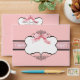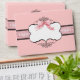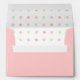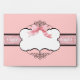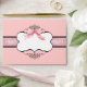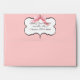 This Matching envelope features elegant French copperplate swirls, pink and green dots on a white background, hand painted ruffled fabric background, border and a beautiful hand painted pink silk bow. All made from original artwork by Audrey Jeanne Roberts. The result is a beautifully contemporary feminine ensemble. On the inside there is the same dot pattern and on the back flap a bracket revealing a place for your return address. NOTE: This is a flat printed design with the appearance of three dimensional aspects. There are no raised layers or actual gold or silver in the design.