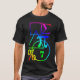 An abstract pattern of geometric and mathematical shapes and symbols on a dark t-shirt.
