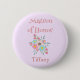 A lovely bridal shower button for the matron of honour, this design features a light purple background with "Matron of Honour" written in fun pink font with a pink and blue flower bouquet in the middle. Under the bouquet is your name in pink font. Personalize your matron of honour button today!