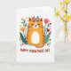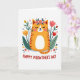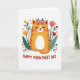 This card features a rounded orange cat with soft reddish-brown stripes, sitting calmly at the center with its eyes closed and a small, tender smile that feels like a quiet cuddle ❤️. A ring of small pink blossoms and green leaves rests on its head, giving it a sweet, cared-for look, like it’s been dressed up by a close friend. Around the cat, matching leafy shapes and simple flowers in yellow and coral-pink form a balanced frame, leaning inward as if they’re gathering to celebrate together. The white background keeps everything airy, letting the warm oranges and fresh greens stand out without looking busy. Near the bottom, a short message is placed beneath the illustration in red lettering, easy to spot against the white space. The overall scene suggests closeness through gentle curves, soft expressions, and the way the flowers seem to cradle the cat in a friendly embrace 🌼. Small decorative leaf and bloom details are scattered evenly around the main figure, with tulip-like shapes and rounded petals repeating in a tidy pattern. The text sits centered below the cat in solid red, while the surrounding flowers alternate yellow and coral-pink beside deep green leaves.