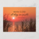 Inspirational scripture postcard depicts a beautiful red and orange sunrise over the water. It features Bible Verse Matthew 19:26, "With God all things are possible."_