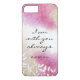 Inspirational quote scripture iPhone case depicts a beautiful leaf design with a green and pink splash background. It features a portion of Bible Verse Matthew 28:20, in in the words of Jesus, "I am with you always."