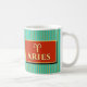 Red and gold signs contrast against a teal-striped background, with the name "Matthew" on one sign and the zodiac sign "Aries" with its symbol on the other. The design features a vintage-inspired colour palette and typography.