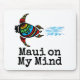 Colourful sea turtle swimming through the ocean, leaving ripples behind it. "Maui on My Mind" written in modern black lettering beneath the design.