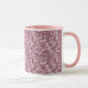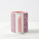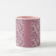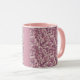This mug features a seamless floral pattern design in shades of pink and purple. The pattern features stylized clover-like flowers with 4-5 petals each, arranged in a repeating geometric layout. The flowers are rendered in a minimalist style with neat lines and soft curves. The background is a mauve purple, while the flowers are depicted in lighter shades of pink and rose. The pattern has a modern, abstract quality with flowers overlapping and flowing in a continuous design. The mug is a pink combo mug. The mug has a pink interior glaze and a pink handle. The mug is microwave and dishwasher safe.