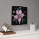 Painted lily in shades of mauve and pink with matching tendrils and green leaves on a black background. Artwork and design by Karlajkitty