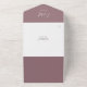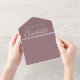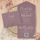 All in one wedding invitation featuring elegant signature script name and monogram initials on a mauve background. The invitation includes a perforated RSVP card with your wedding website QR code. Designed by Thisisnotme©