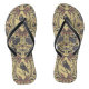 These flip flops feature crows, dragonflies, and beetles surrounded by flowers and leaves in shades of mauve and grey on a tan background.