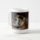 A Pet Dog named Max shot close up with tongue out and sun glasses on . On a cup.