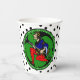 These paper cups feature HoMeArt's original variation of a pre-WWI Maxfield Parrish elf w/ white & black polka dot tights against kelly green round medallion floating above a black on white polka dot background. The greeting 'Merry Christmas' is repeated encircling the medallion.