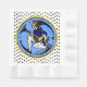 Stylish Hanukkah Napkin features IconDoIt's original variation on a pre-WWI era Maxfield Parrish elf character w/ polka dot leggings, a menorah on his shoe, on a periwinkle circle, coordinating dreidels & black polka dots on white backdrop. Customizable greeting on back.