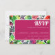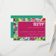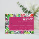 This RSVP card radiates with a vibrant and eye-catching display of tropical leaves in a mix of green, orange, purple, and magenta pink. Showcasing a maximalist style, the magenta frame pops with the text 'RSVP' in a bold font. On the reverse side, the Paolo Veronese green background is accented by the couple's initials in a bright orange placed on a white band, creating a sophisticated look.