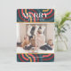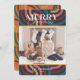 This retro, maximalist, kitsch, and modern "Merry Christmas" Christmas holiday card features a teal background with geometric patterns. The reverse side features a mustard yellow background with geometric patterns. Personalize it for your needs. You can find matching products at my store.