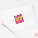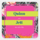 Pink rounded square shape over pink orange and peach modern floral with dark marbleized design. Names in blue over neon yellow bars. Remaining text is white.
