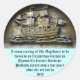 A set of round stickers featuring a picture of a stone carving of The Mayflower, to be found in an Elizabethan Garden on Plymouth's historic Barbican.