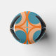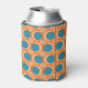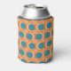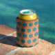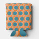 This can cooler has a mid-century modern design of open orange circles with solid teal circles running across the pattern with teal vertical lines and orange horizontal lines.