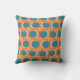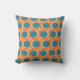 This throw pillow has a mid-century modern design of open orange circles with solid teal circles running across the pattern with teal vertical lines and orange horizontal lines.