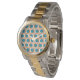 This watch has a mid-century modern design of open orange circles with solid teal circles running across the pattern with teal vertical lines and orange horizontal lines.