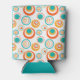 This can cooler has a mid-century modern design of concentric circles in gold, orange, and turquoise on a white background.