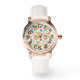 This women's watch has a mid-century modern design of concentric circles in gold, orange, and turquoise on a white background.