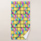 This towel set has a pink washcloth, a seafoam hand towel, and a bath towel with a mid-century modern design of crescent moons divided horizontally into three colours, pink, blue, lavender, or seafoam, split in half and scattered on a grid with a yellow background. If you like the design but want different colours, message me.