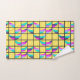This towel set has a mid-century modern design of crescent moons divided horizontally into three colours, pink, blue, lavender, or seafoam, split in half and scattered on a grid with a yellow background. If you like the design but want different colours, message me.