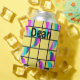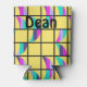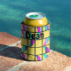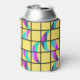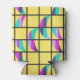 This can cooler has a mid-century modern design of crescent moons divided horizontally into three colours, pink, blue, lavender, or seafoam, split in half and scattered on a grid with a yellow background. If you like the design but want different colours, message me.