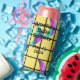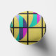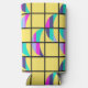 This seltzer can cooler has a mid-century modern design of crescent moons divided horizontally into three colours, pink, blue, lavender, or seafoam, split in half and scattered on a grid with a yellow background. If you like the design but want different colours, message me.