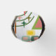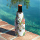 This bottle cooler has a mid-century modern design of Christmas trees in different styles. One has a grid with rectangles with starbursts inside. Another has rounded rectangles with smaller rectangles inside. A third has curved lines with stars on them. The final tree is a triangle with other smaller triangles inside.