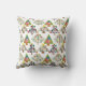 This throw pillow has a mid-century modern design of Christmas trees in different styles. One has a grid with rectangles with starbursts inside. Another has rounded rectangles with smaller rectangles inside. A third has curved lines with stars on them. The final tree is a triangle with other smaller triangles inside