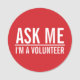 Me demander | Red Volunteer Badge avec texte en blanc gras sans serif police sur arrière - plan rouge.