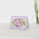 This greeting card features a soft, uplifting bouquet of spring flowers in a dreamy palette of purples, lavender, coral, peach, and blush. The blooms are illustrated with gentle watercolor strokes on textured paper, giving the design a fresh, airy feel.