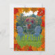 Add your autumn wedding information to this beautiful card. All text is adjustable to move, resize, and change the font and colour. Convert this for any occasion. In the middle of the meadow sits a white antique-looking table with chairs. On top of the table is a flower pot with red flowers. In the background are the trees that are starting to change with the early fall.