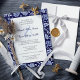 A floral wedding invitation with a pattern of meadow wildflowers in indigo blue. The meadow wildflowers create a delightful border, their natural beauty framing the text, which adds a touch of sophistication to the design. The result is an invitation that perfectly balances the rustic charm of the countryside with a touch of timeless elegance. A decorative script font is used for the couple's names with an ampersand in between.