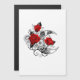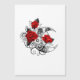 Contour, mechanical crescent moon with gears, decorated with red roses with black spiked stems and leaves on white background. Steampunk