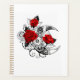 Contour, mechanical crescent moon with gears, decorated with red roses with black spiked stems and leaves on white background. Steampunk