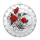 Contour, mechanical crescent moon with gears, decorated with red roses with black spiked stems and leaves on white background. Steampunk