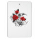 Contour, mechanical crescent moon with gears, decorated with red roses with black spiked stems and leaves on white background. Steampunk