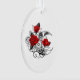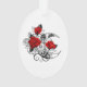 Contour, mechanical crescent moon with gears, decorated with red roses with black spiked stems and leaves on white background. Steampunk