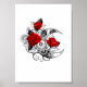 Contour, mechanical crescent moon with gears, decorated with red roses with black spiked stems and leaves on white background. Steampunk