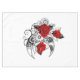 Contour, mechanical crescent moon with gears, decorated with red roses with black spiked stems and leaves on white background. Steampunk