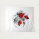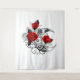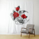 Contour, mechanical crescent moon with gears, decorated with red roses with black spiked stems and leaves on white background. Steampunk