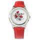 Contour, mechanical crescent moon with gears, decorated with red roses with black spiked stems and leaves on white background. Steampunk