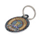 Clan MacKay crête badge entouré d'une sangle et boucle sur l'arrière - plan tartan bleu. Texte personnalisé des deux côtés.
