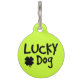 Cette étiquette de chien de rond comporte les mots, "chien chanceux" dans le noir sur un arrière - plan vert, avec un shamrock. Entièrement personnalisable ! Ajoutez votre dos personnel d'information dessus, ou le supprimez si désiré.