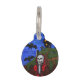 Cette étiquette d'identification d'animal de compagnie a un squelette de faucheuse sombre dans une cape rouge à capuche debout près d'une clôture en bois avec une maison hantée et des pierres tombales sur une colline derrière lui avec des chauves-souris volant au-dessus d'un ciel nocturne bleu profond. Customisez le nom de votre animal de compagnie et votre numéro de téléphone au dos du modèle.