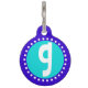 Cette étiquette ronde pour animaux de compagnie comporte une lettre G initiale en minuscules graphique sur un bleu royal et un arrière - plan aqua, entouré d'un cercle de points blancs. Entièrement personnalisable ! Ajoutez les informations personnelles de votre chien sur le dos, ou supprimez si vous préférez.