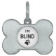 Balise simple en noir et blanc conçue pour les animaux aveugles. Il y a un texte "Je suis aveugle" au milieu et une petite silhouette empreinte de patte noire en dessous.